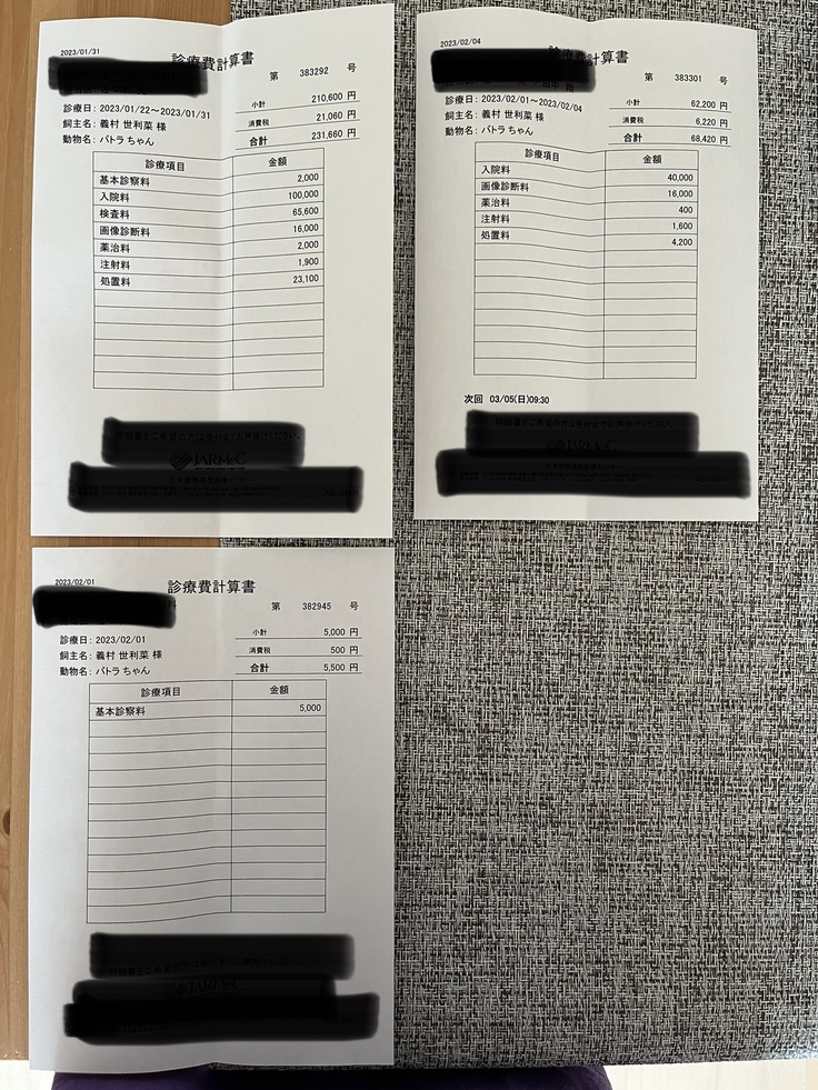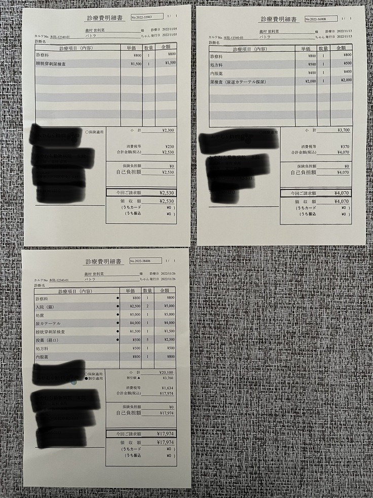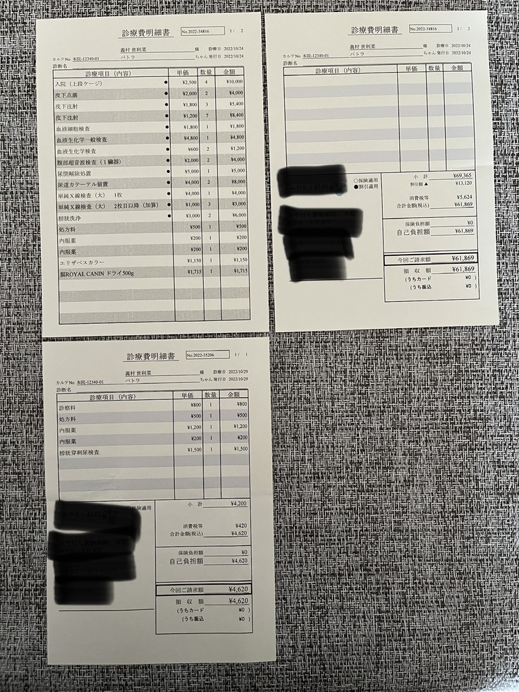 我が家では保険に入る選択はせず、猫用に貯金をして約50万円程備えておりましたが、ここまでで約70万円かかっており、はるかに貯金額を超える金額になりました。