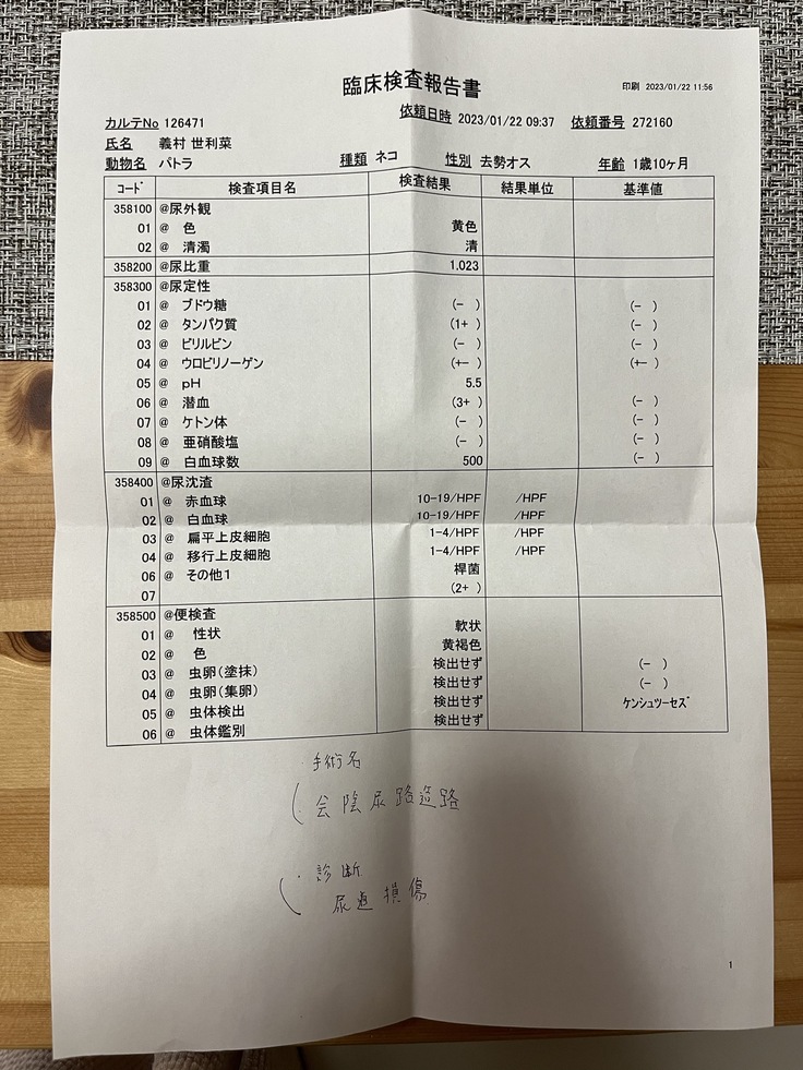 そして1月22日の抜糸の際の診察で、縫合部に化膿が見られ、このままおしっこが出る穴にも膿が広がってしまうと、やがて全身に細菌や毒が行き渡り死亡してしまうとのことで、そのまま再入院となりました。