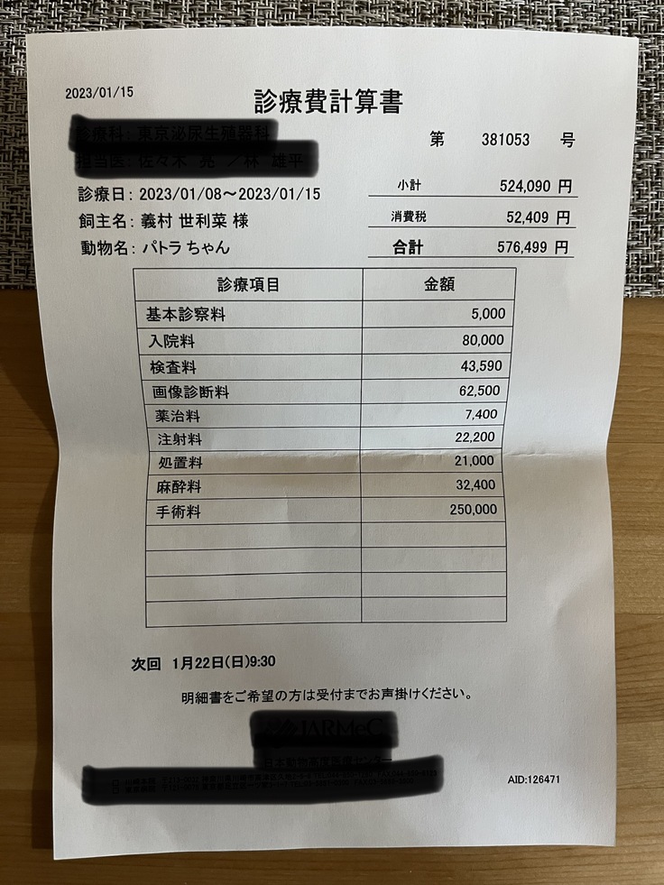 翌日の1月9日に手術をしていただき、退院日の1月15日、手術費576,499円を支払いました。