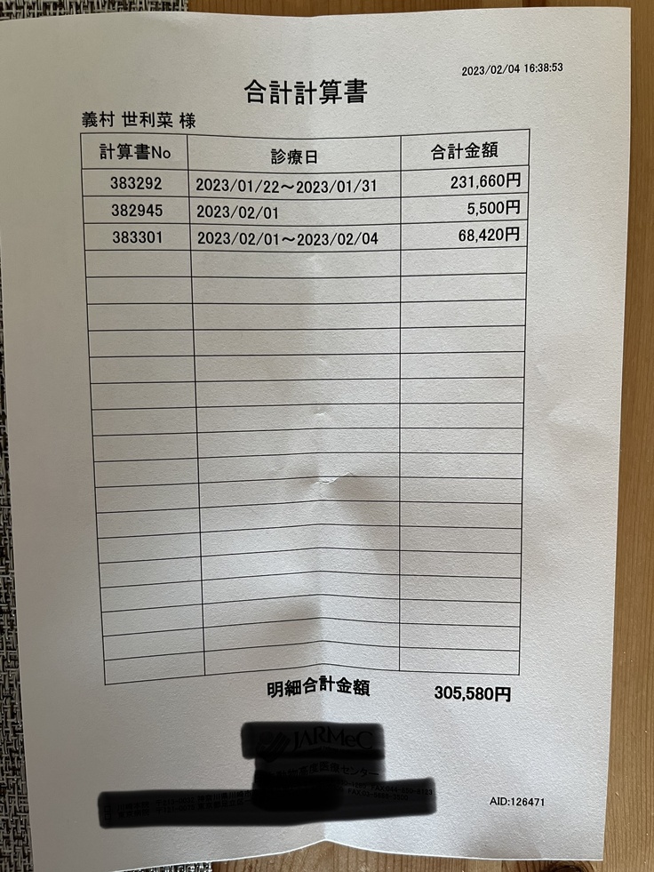 今回の再入院は1月22日から2週間入院し、2-4日に退院しました。入院費、処置料などを全て含め、305,580万円です。