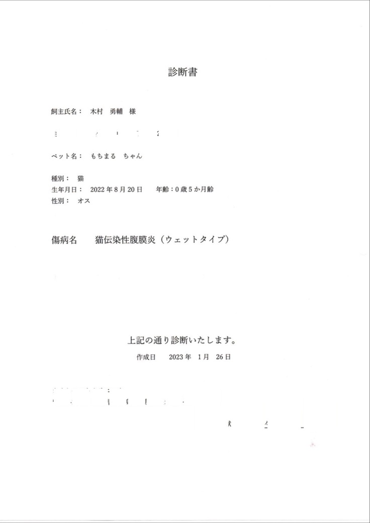 FIP猫伝染性腹膜炎の治療終了日 投薬の薬代60万と検査代