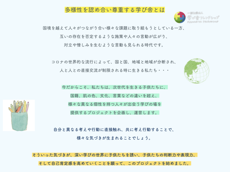 学び舎フレンドシップは、次のようなコンセプトで活動しています。