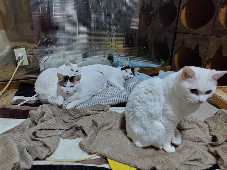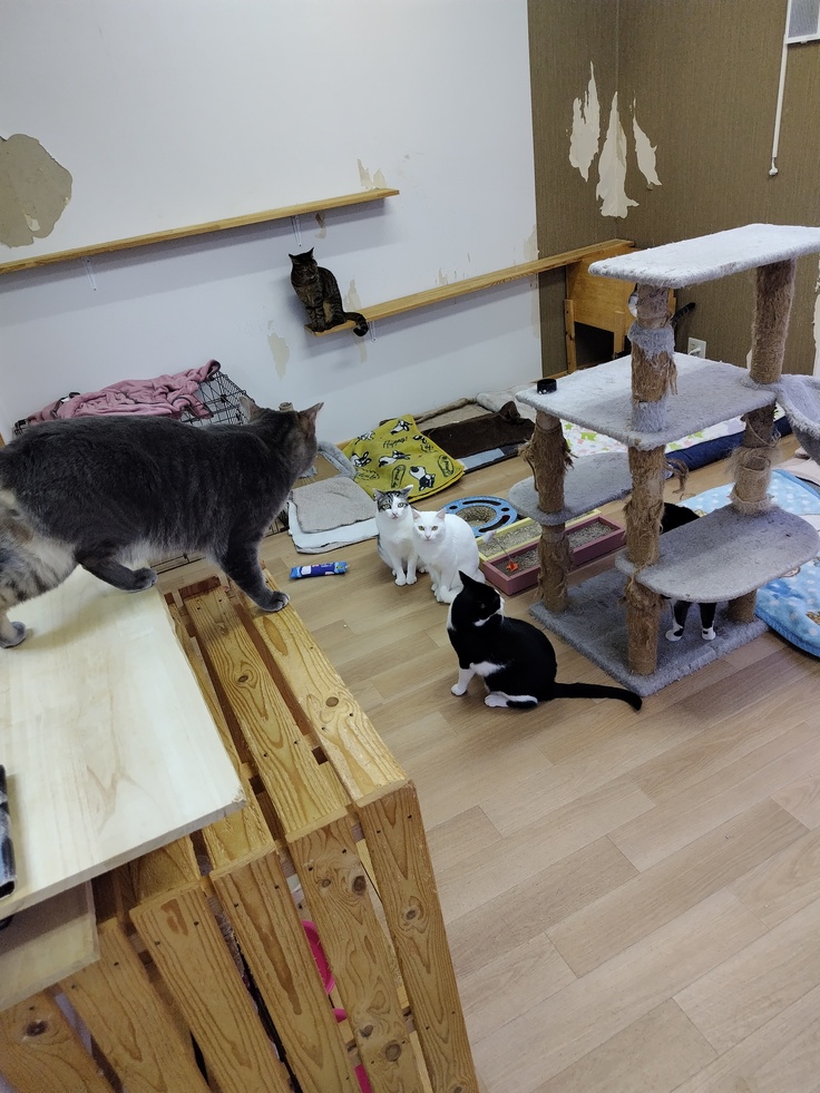 その内の1匹が、トラックターに轢かれ亡くなりました。その後、6匹の親子が工場に住む様になり、また同じ事が起こると思い。家に連れて帰り保護し、自宅の2階を保護猫ハウスにしました。