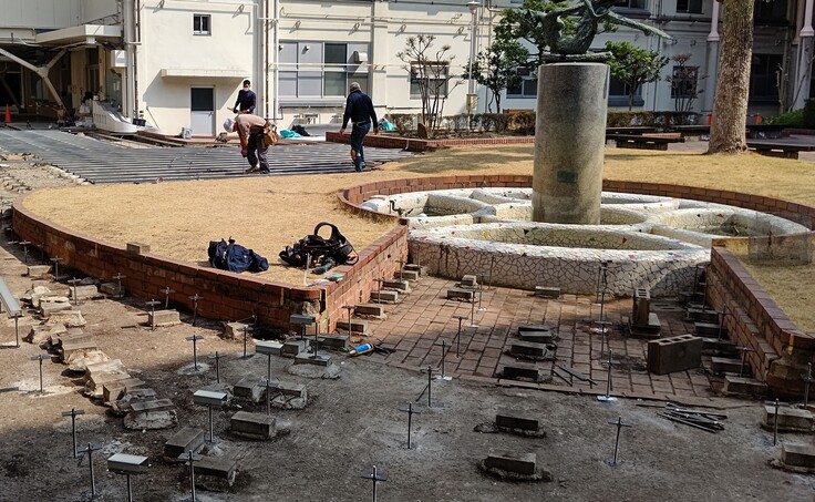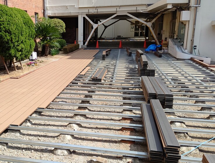 中庭工事では予算がないことから、残材の撤去費用がでないので、