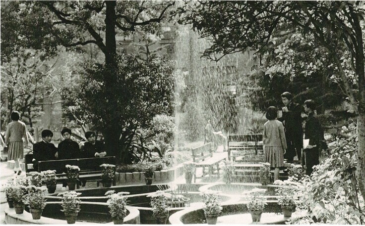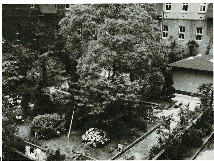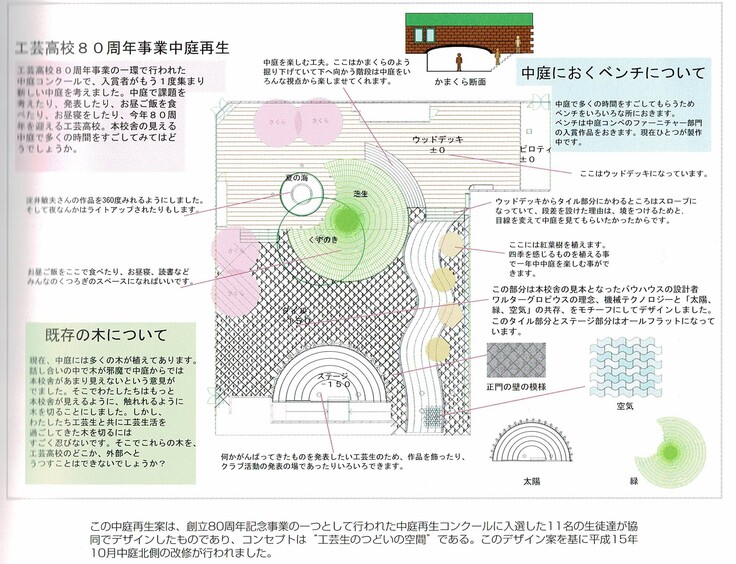 写真は昭和40年代の中庭と、80周年記念事業も中庭再生の学生達の案