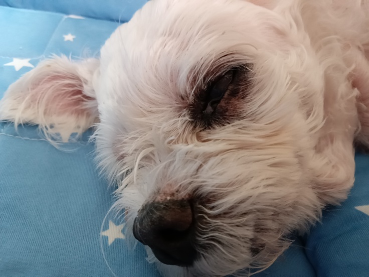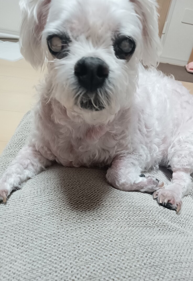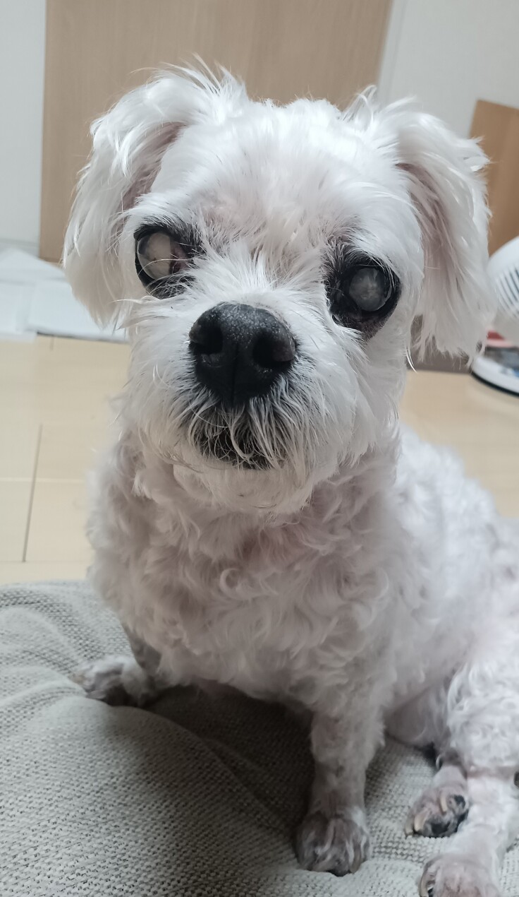 白内障の手術は高齢犬、免疫疾患があり麻酔のリスク、臓器不全リスク、手術をして必ず見えるようになる可能性は高くないとのこと。