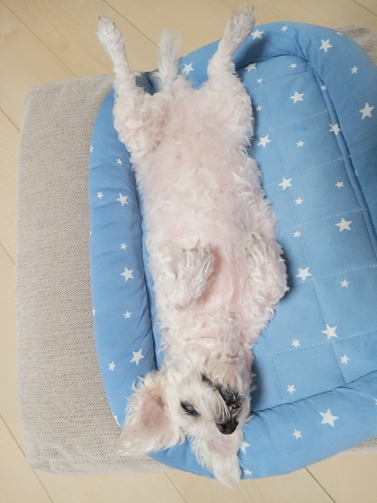 暑さに弱いはなこは家でずっと冷房のなか過ごしていますので、時折寒そうにくるまって寝ています。