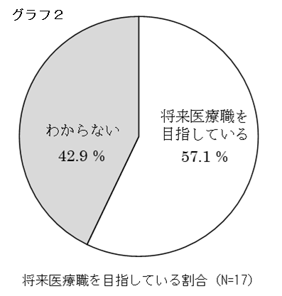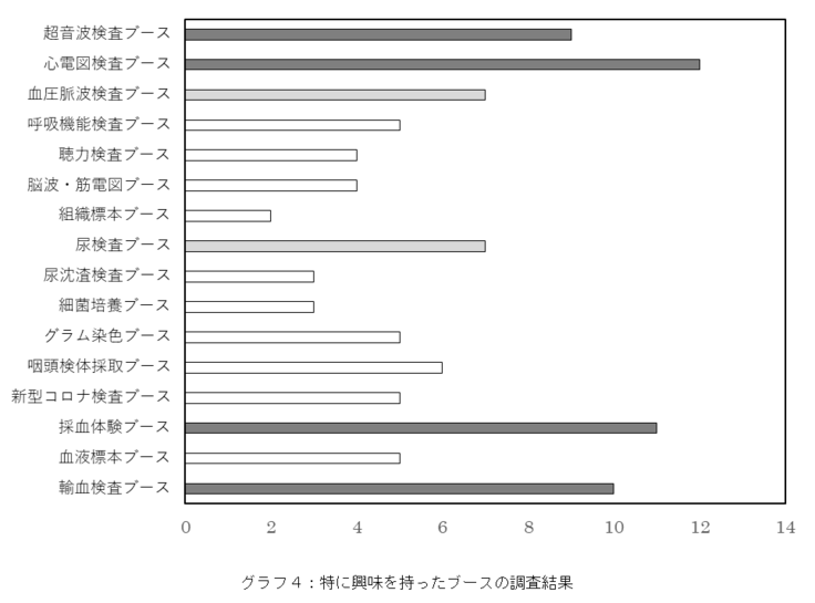 参加者を対象に実施したアンケート調査の結果では(グラフ2)、「将来の仕事として医療従事者を目指しているか」という質問に対し、イベント参加者のおよそ4割が「わからない」と答えました。一方で、「本企画に参加したことで臨床検査技師に興味を持ったか」という質問に対しては、参加者の8割近くが「興味を持った」と答えたことから(グラフ3)、本企画実施による一定の成果が得られたと思われます。 また、「どのブースに興味を持ったか」という質問に対しては、グラフ4に示したように、超音波検査ブースや心電図検査ブース、採血体験ブース、輸血検査ブースなどの人気が高いことがわかりました。この結果は、今後のオープンキャンパスの企画立案の参考にしたいと思います。