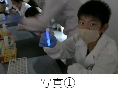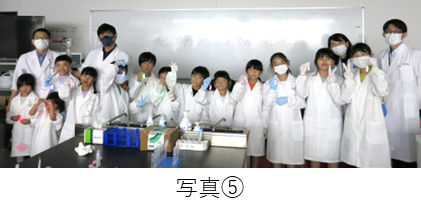 企画終了後に、それぞれ自分で調合して作ったお気に入りの色の液体を細胞保存用チューブに封入し、光るキーホルダーを作成しました。 写真⑤は、光るキーホルダーを手にして撮影した集合写真です。子供たちの楽し気な様子が伝わるかと思います。
