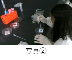 自由研究コースは、夏休み中の小学生を対象とした体験型企画で、化学反応により生み出される光をテーマに、いくつかの実験を体験してもらいながら、自然科学に興味を持ってもらうことを目的としました。本企画は二部制とし、第一部では「光る血」というタイトルで、犯罪捜査を模して参加者たちにルミノール反応で血液を光らせる体験をしてもらいました。写真①は、自分たちで調合したルミノール試薬に血液を加えてもらい、血液が光ることを確認している様子です。また、写真②は、容疑者の衣服に付着した赤色の色素が、血液かどうか確認している様子です。「血が光る」という不思議な現象と、犯罪捜査という非日常的な体験に子供たちは興味津々の様子でした。