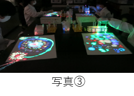第二部では、「光の絵の具」というタイトルで、化学発光により作り出した3種類(光の三原色)の光る液体を用意しました。子供たちには、この3種類の光る液体を混ぜ合わせて作った光の絵の具を使って絵を描いてもらいました。写真③、④はその様子を撮影したもので、それぞれ自分だけの色を調合して作り出し、独創的な光る絵を描いていました。
