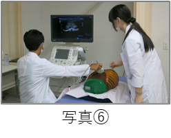 超音波検査は、生理機能検査の中でも特に高度な技術が求められる業務です。今回は、医療用シミュレータを用いて、腎臓や肝臓などの超音波画像を映し出す体験をしてもらいました(写真⑥)。自分で撮影した超音波画像の写真をもらい、皆さんうれしそうな様子でした。