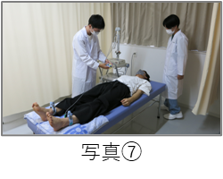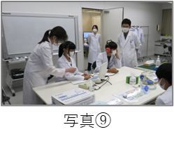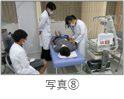 心電図検査は、心筋梗塞や狭心症などの診断に重要な検査です。写真⑦は、患者役の大学生の心電図を実際に参加者に取ってもらっている様子です。医療系のテレビドラマなどで見た心電図を、実際に自分がとっていることに皆さん興味深い様子でした。