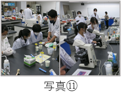 検体検査ブース(写真⑪)では、疑似患者尿による尿定性試験を体験してもらいました。参加者達は、疾患に応じて尿試験紙の色調が変化することに興味をもったようです。また、精密検査として尿沈渣検査の標本を顕微鏡で観察してもらいました。病理組織検査ブースでも、腎臓や肝臓など、理科の教科書に出てくる臓器の組織標本を顕微鏡で観察してもらいました。