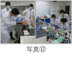 細菌検査ブースでは、細菌の培養や薬剤感受性試験などの説明に加え、グラム染色法による細菌の鑑別ついても説明しました。食中毒で有名な黄色ブドウ球菌や大腸菌などを顕微鏡で実際に観察した参加者たちは微生物の世界に興味を持ったようです。また、ウイルス検査ブース(写真⑫)では、医療用シミュレータを用いて咽頭部から検体を採取する体験をしてもらいました。さらに、疑似検体を用いた新型コロナウイルスの抗原検査体験やPCR検査の説明なども行いました。