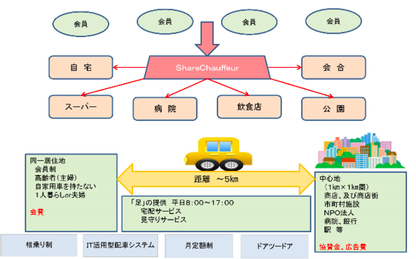 ショーファーとはお抱え運転手の事で、同一地域に居住する複数の高齢者に運転手付きの車両をシェアして利用します。金額は相乗り制・月定額制とし、あまり負担をかけずに頻度に合わせて選択し利用できるようにします。