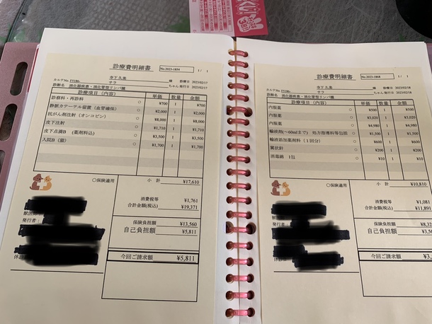 サラは保険に入っているので、先生と相談し、検査日・抗がん剤治療日・お薬受取日の3日間に分ける事にしました。これで、約10,000円ぐらい治療費が下がります。写真は抗がん剤と薬代この前日に検査をしています。