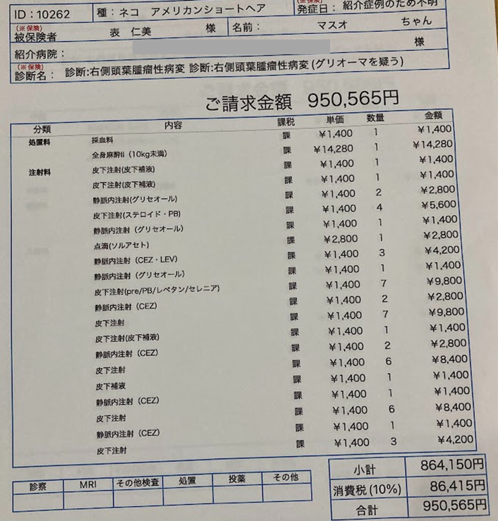 そしてマスオの病気は悪性脳腫瘍であるため、今後も抗がん剤治療・抗がん剤副作用の確認のための頻回な採血・1~3か月に1回の全身麻酔での高額なMRI検査が必要になります。