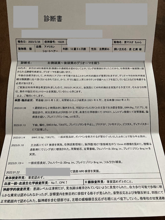 2023年1月2日、毎日何回もふみふみをし大音量のゴロゴロ音を鳴らしながら甘えて元気に過ごしていたマスオの様子がおかしくなり、様々な検査を実施した結果、猫では極めて珍しい悪性度の高い脳腫瘍(グリオーマ)であることが発覚しました。