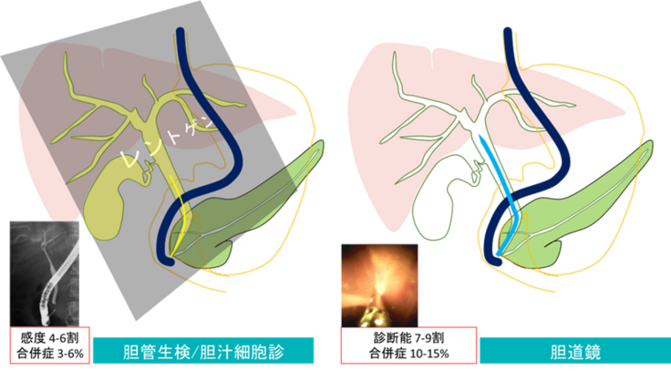 透視化の胆管生検と胆汁細胞診は感度4-6割、直接観察しながらの胆道鏡下胆管生検であっても診断能は7-9割とされています。胆管は細く腫瘍も小さいため、採取できる組織が少量であることが特徴です。