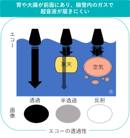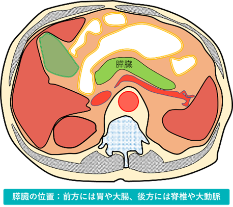 腹部エコーやCT、MRIで膵がんが疑われた場合、なるべく早期に確実な診断をする必要があります。膵臓は腹腔と呼ばれるおなかの臓器を収めるスペースの最も背中側に存在し、前方には胃や大腸、小腸が存在し、後方には背骨(椎骨)や大動脈があります。膵臓は直接観察することが難しい位置に存在しているのです。