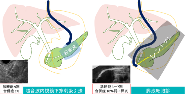 診断能は9割であり、1割は血管や膵管をよけることができない場合や、比較的早期のいわゆる『上皮内がん』では塊になっていないため穿刺できないなどが理由で診断ができません。合併症としては出血や膵炎が1%程度あります。