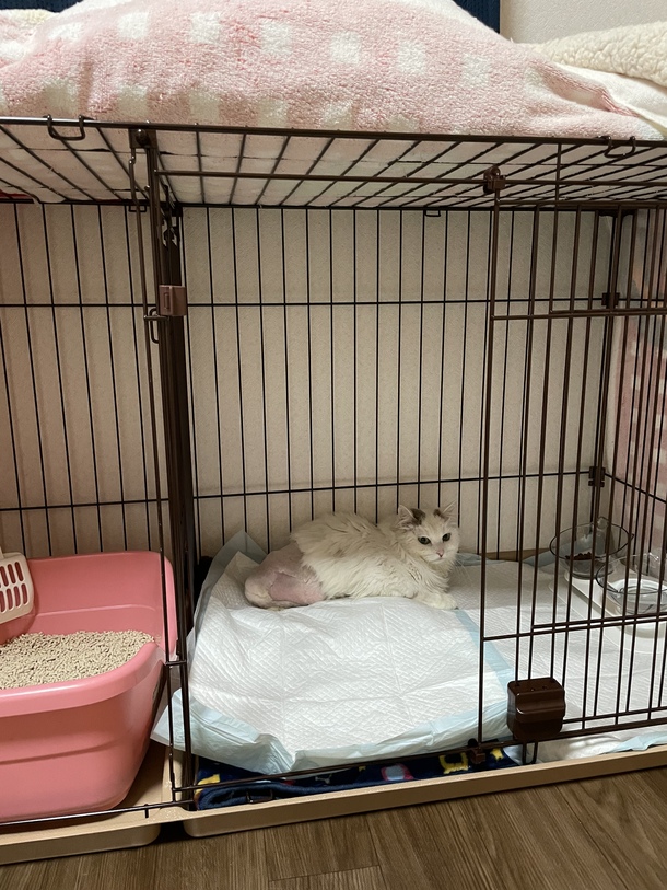 先日、担当医の先生から順調な回復で、もう少し広いケージへの許可が出たので、本日トイレを置けて歩くスペースのあるケージへ引っ越しました♪