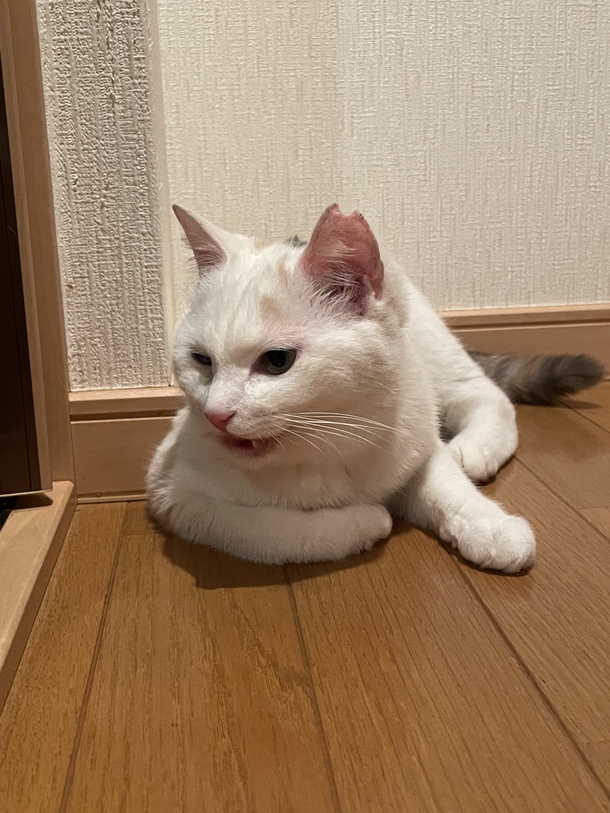 白ちゃんはもともと右目に傷が治った跡らしいですが、白濁があります。僅かな可能性に賭けてステロイド系と抗生剤系の目薬をさしています。嫌な味が目から口の中に広がるらしく毎回こんな感じに嫌な顔をします💦