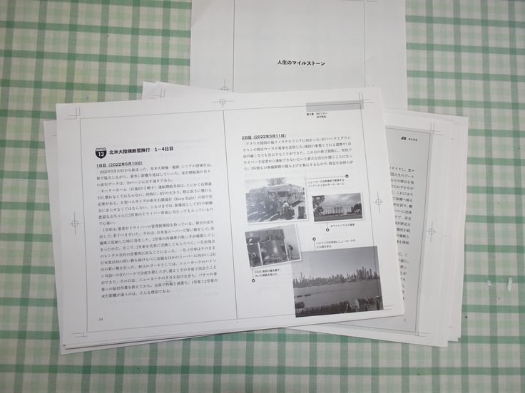 表紙のイラストが完成いたしました。添付写真をご覧ください。前回お知らせした表紙案に比べ、RVが写実的になり、我々が実際にレンタルして大陸を走破した実物をスケッチしてくれたようです。次に、原稿本文の写真をご覧ください。本文も原稿の確認チェックが進み、最終原稿、つまり修正が出来ない念校ゲラというそうですが、そこまで進捗することが出来ました。正月休みを活用して、念校を確実にチェックして、皆様に一刻も早く完成本をご披露できるように頑張ります。