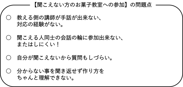 しかし、私には上記の問題を解決し、聞こえない方にもお菓子作りを心から楽しんでいただく為の、