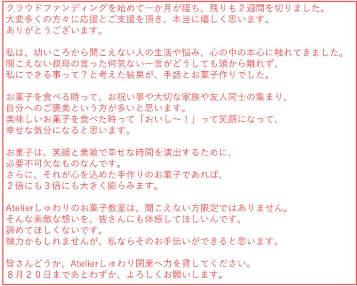 聴こえる方はもちろん。ろう者、難聴者、中途失聴者の方。聴者の私だからこそ、皆さんを応援することができます。美味しいお菓子を作ってみたい!家族や大切な人に笑顔になってもらいたい。その想いはお一人お一人違うと思います。私は、今まで多くのみなさんのお誕生日ケーキやお菓子をお作りする機会から、たくさんの満開の笑顔と幸せに出会うことができました。私自身コロナの自粛生活の中で、初めて自分自身のために作ったスイーツに救われて、笑顔で過ごすことができました。スイーツは幸せな気持ちと癒しをもたらし、たくさんの方を笑顔にする魔法の力があります。そして、お菓子作りを通して、コミュニケーションの輪となり大きく広がっていきます。 みなさんにどうか、この想いが届きますように!みなさんの想いを背負ってクラウドファンディングに挑戦します。これから出会うみなさんとの一期一会を、心から楽しみにしています。
