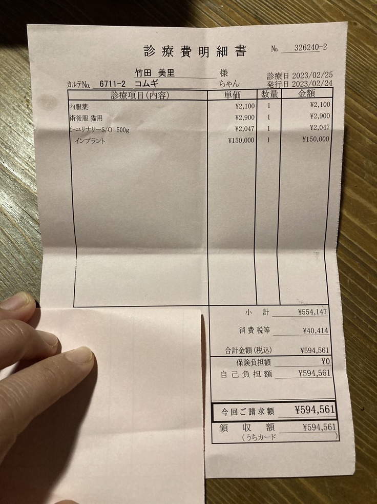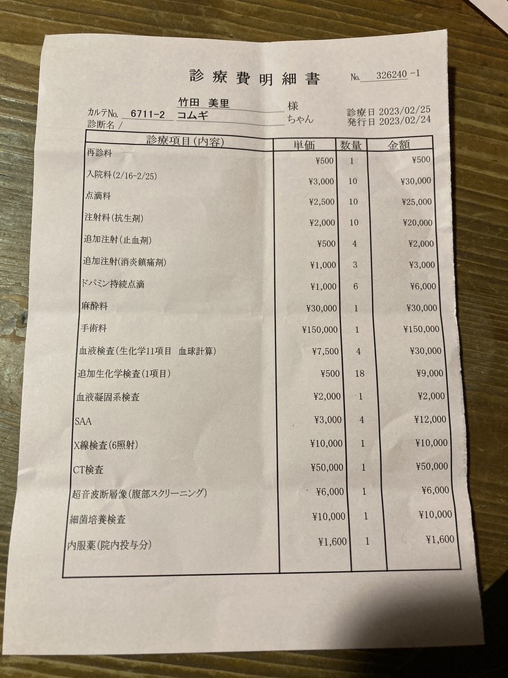 集まった資金は全額、「こむぎの手術の費用の支払い:約60万円」「手術後の1ヶ月通院の費用:8,5万円」に充てさせていただきます。