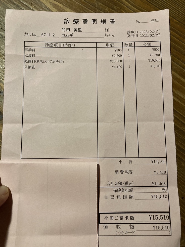 退院からの1ヶ月間の通院費 約85,000円(点滴13日分、内服薬3週間分、血液検査2回、尿検査2回、subシステム洗浄2回分)