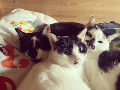 カモメ(4歳♂)コムギ(4歳♀)オハナ(2歳♀)毎日追いかけっこをしたり、仲良くくっついて寝たりと幸せに暮らしています。
