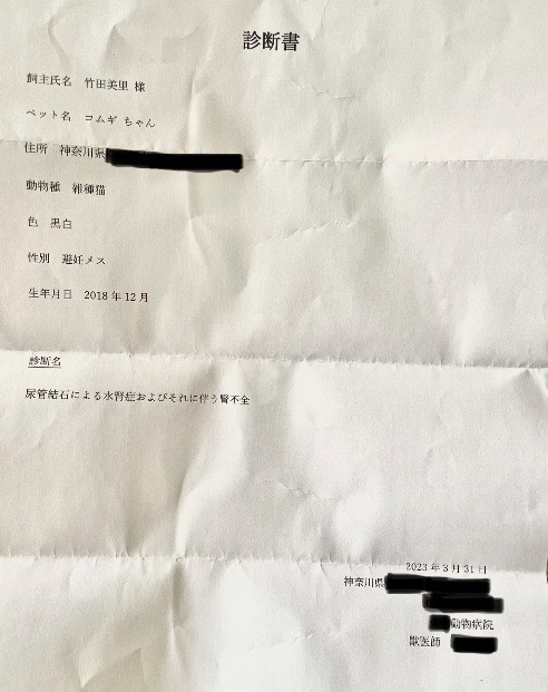 ページ上に掲載している診断書や診療明細書などの資料は全て動物病院から掲載の許諾を得ております。※個人情報のため、先生の名前は見えないようにしています。