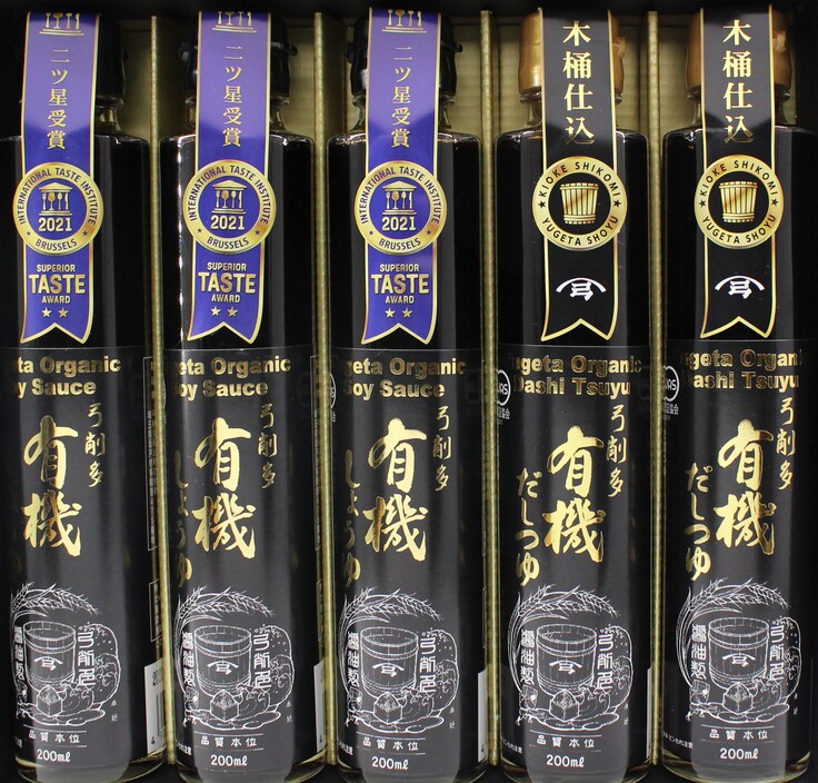 ■国内産有機大豆※1、国内産有機小麦※1、海水を干してできた天日塩を使用した有機しょうゆ※1、吟醸純生しょうゆを製造しております。(国内産有機原料を使用した醤油は、全醤油量の0.1%にも満たしません。※2)