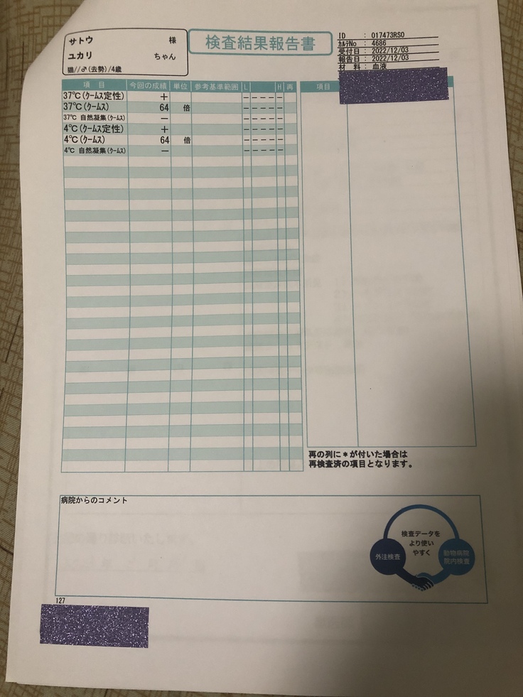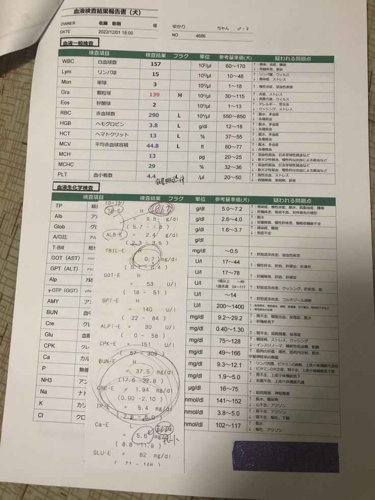 昨年の12月、血尿が出て動物病院へ連れていったところ、血液検査にて貧血の数値が悪く貧血の注射を打たないと死んでしまうレベルだと先生から言われました。