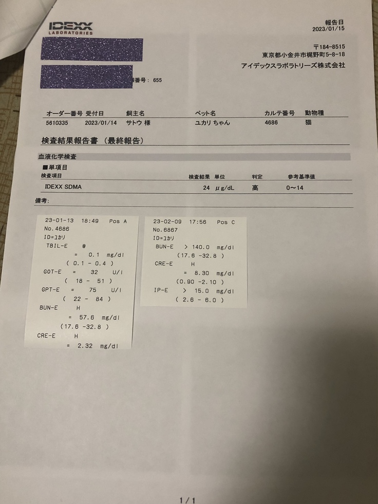 1月中旬の血液検査で腎臓の数値が非常に悪くなっており、1/26に血液検査、レントゲン・エコー検査の結果腎不全のステージ3と診断され腎臓の薬も追加で服薬を開始。また自宅での点滴治療を開始しました。