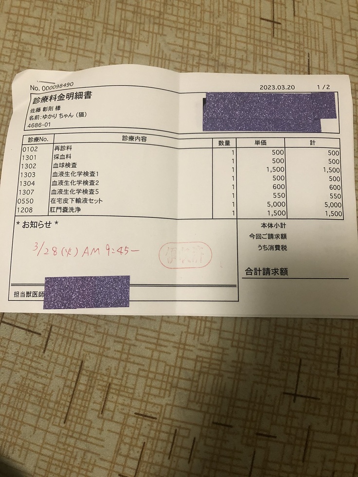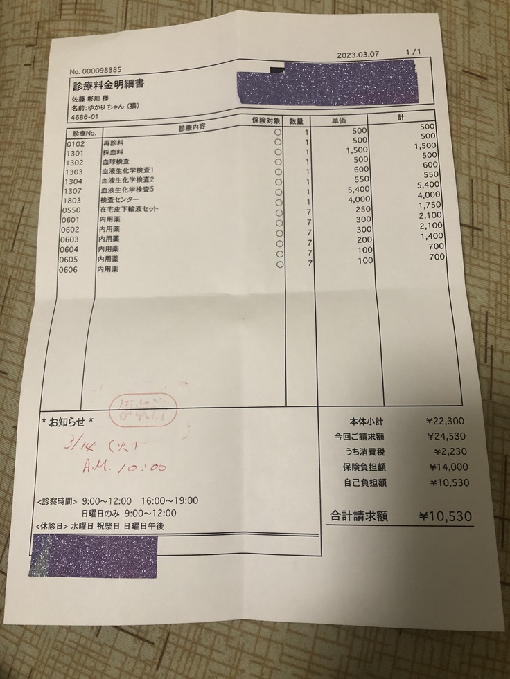 治療内容によって、金額に差が出ていますが、3/7の通院費24,530円で窓口でアニコムの保険証を見せてお会計が10,530円です。(この日の診察では在宅皮下輸液セット、1セット4000円を1セットだけ用意してもらったので金額が安くなっています。その前の週では2セットもらっています。また貧血の進み具合によって注射8000円を打つ日があり、3/7は打たなかったのでこの金額になっています。)アニコムを使った領収書です。