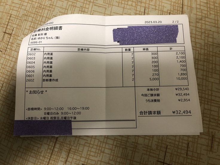 ページ上に掲載されている診断書や領収書、検査の結果などは全て動物病院から掲載の許可を得ております。