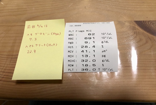 先生から貧血の注射(骨髄を刺激して血を増やすもの)は今回は打たなくても大丈夫とのことで打ちませんでした。