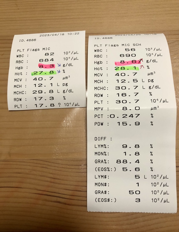 ステロイドのミリ数を変えてから3週間ほどで少しずつ上がっているため、注射をせず様子を見ることになりました。ステロイドも前回と同じミリ数で処方となりました。