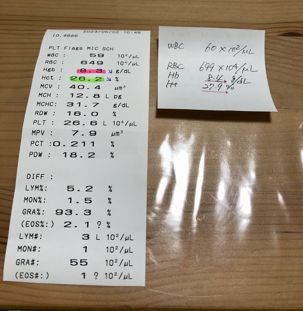 結果をいつも印刷してもらっていますが、貧血を調べる検査の機械で先生のカルテ用と私に渡すので2回印刷してしまうとデータが消えてしまうらしく、今回から貧血の結果は先生の手書きになりました。