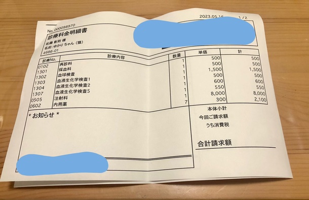 今回は貧血が進んでいたため、注射(8000円)を打ちました。在宅皮下輸液セット(5000円)は2日おきの輸液になったため来週分まである為、今回はそのお金は入っていません。