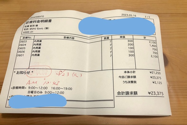 今回は在宅皮下輸液セットのお金は入っていません。注射代8000円が入ってこの金額になっております。