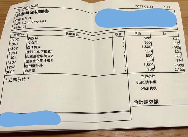 在宅皮下輸液セットは今回から中止をして、様子を見ることになったため(5000円)と注射は(8000円)貧血の数値が先週の注射で上がったため今回は打ちませんでした。