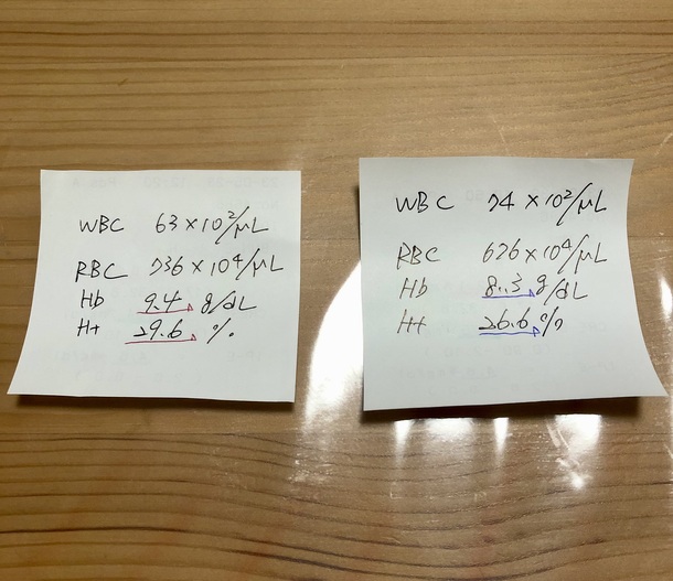 前回Hb(ヘモグロビン)9.4→8.3 Ht29.6→26.6とやはりちょっと下がっています。