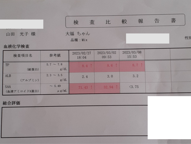 3月8日におこなった血液検査で、入院当時に高かった炎症数値(SAA)が改善されていました😊