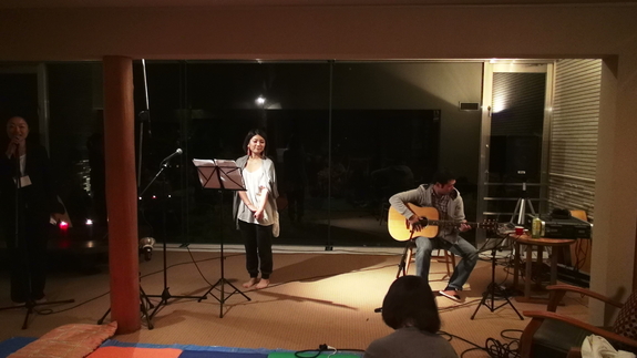 夕食後にギター演奏と歌によるミニライヴを開催しました。選曲も大人が楽しめるようオノリサのヴォサノバやスキマスイッチなどにしました。アンケートでは選曲が良かったと喜ばれました。