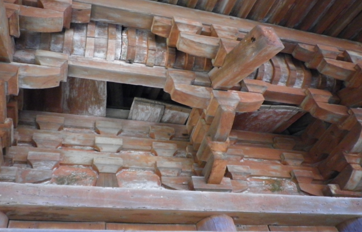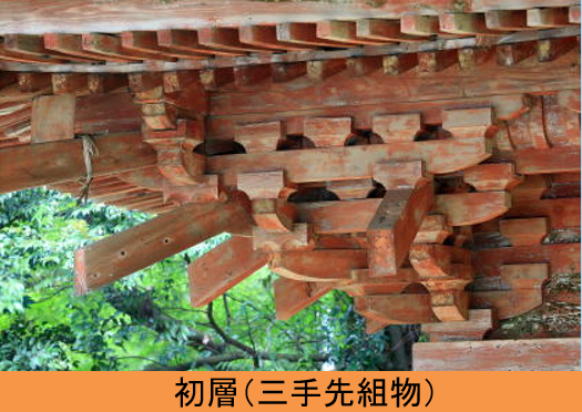 組物(くみもの)とは、中国由来の伝統的な木造建築において屋根を支えるために柱頭に設ける部材で、三手先(みてさき)は柱から外方に斗(ます)組みが三段出ているものです。手先の多い組物が格が高いとされています。